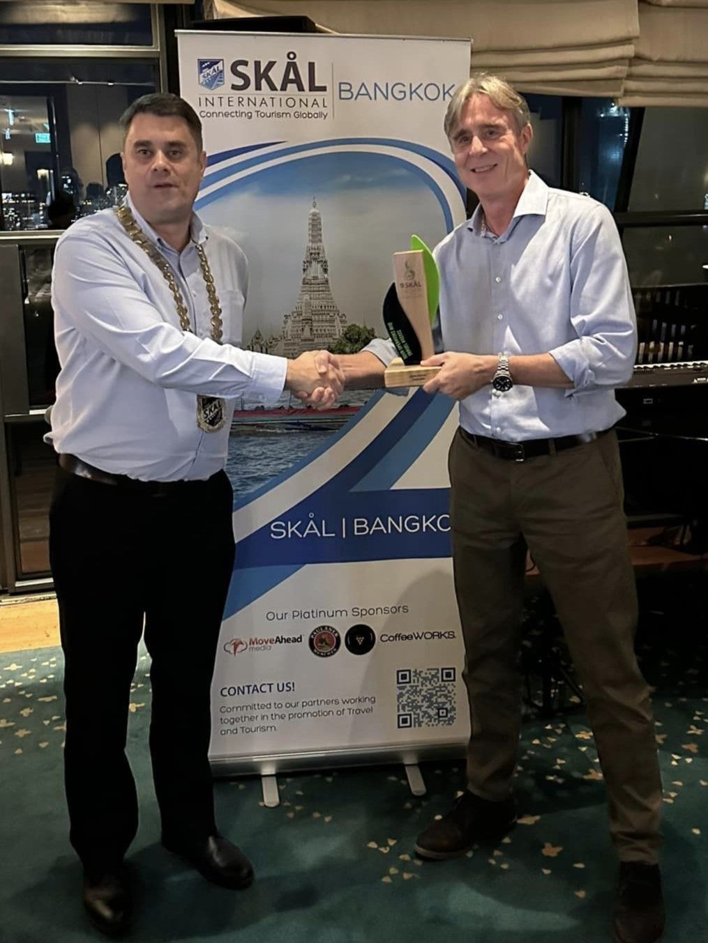 A highlight of the evening was the presentation of the Skål International Sustainable Award 2023 to Khiri for its initiative “Khiri Reach”. This prestigious award, announced at the World Congress in Spain, was graciously accepted by Mr. Willem Niemeijer, Chairman of YAANA Ventures, from Skål International Bangkok President James Thurlby. Khiri Reach, the charitable arm of Southeast Asia-based Khiri Travel, has won for its submission, “Sixteen Years of Reaching Out in Asia”.